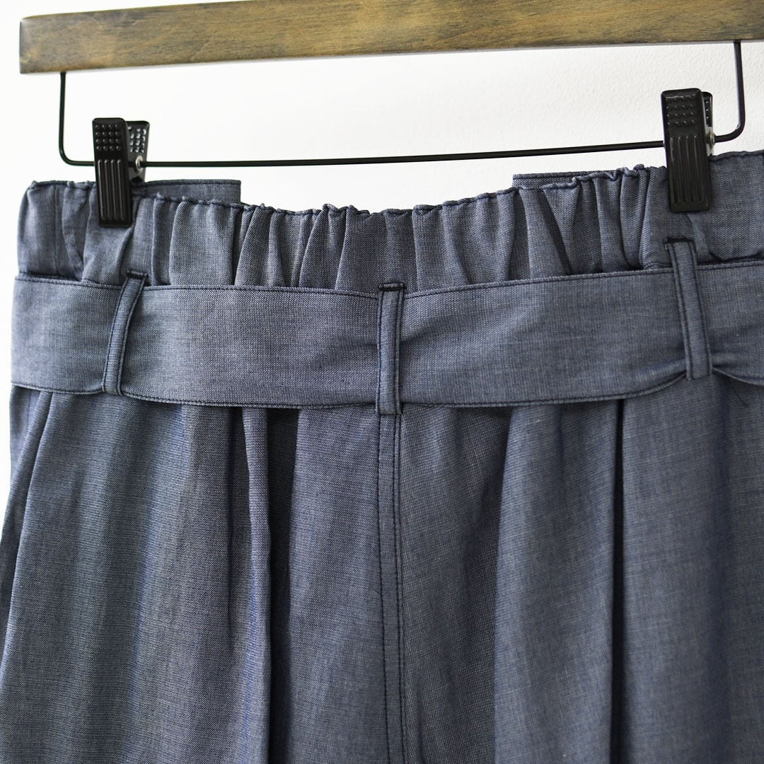 ウエストはイージー仕様でリラックス感のある仕上がり。さらに共布のリボンがさりげないアクセントとなり、ラフになりすぎず洗練された印象に。