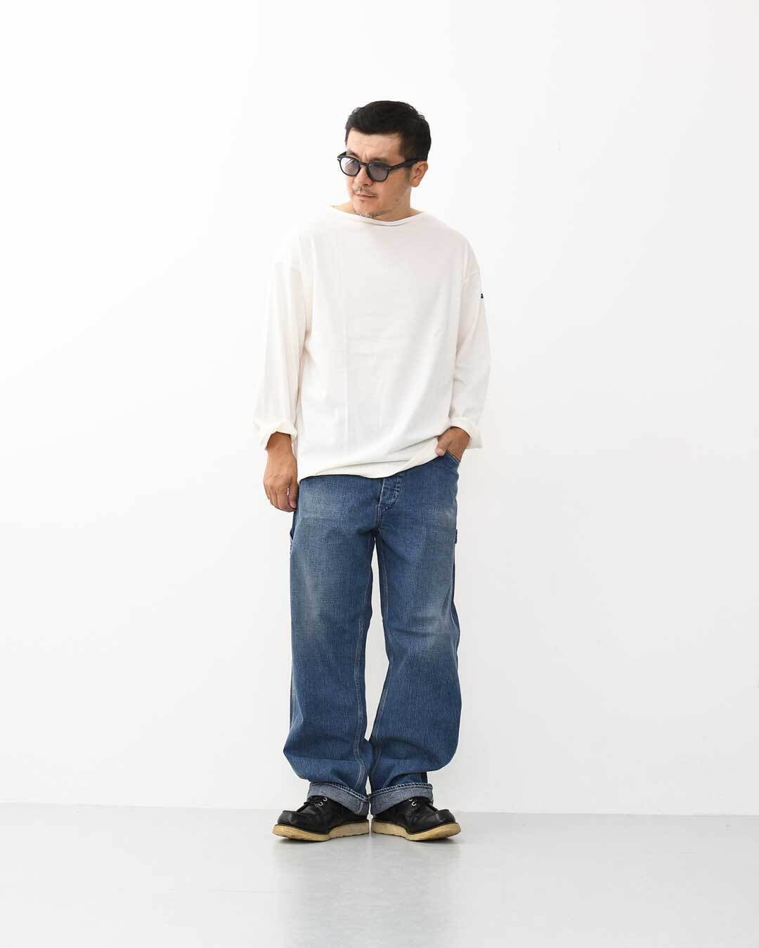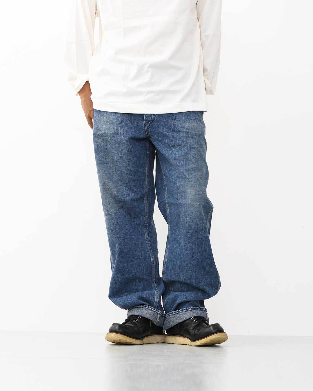 そのブルーとホワイトの間に、ペンキの加工を加え唯一無二な一本に仕上げています。 シルエットは緩め。ストレートの中に、程よいテーパードを加えることで、自然なシルエットを生み出します。