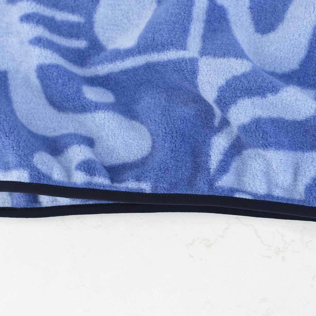 漁網をリサイクルして海洋プラスチック汚染の削減に貢献する、4.9オンス・4プライ・ネットプラス・ポストコンシューマーリサイクル・ナイロン100%のファイユ。PFASを意図的に使用せずに製造されたDWR(耐久性撥水)加工済み。縁取りの素材はブルーサインの認証済み。フェアトレード・サーティファイドの工場で製造