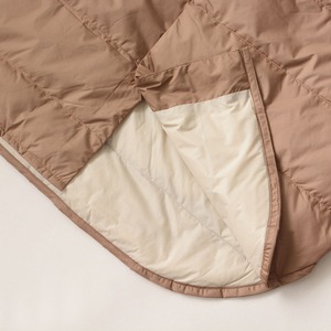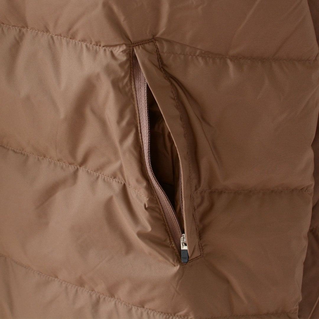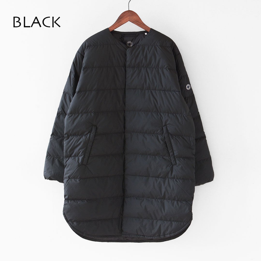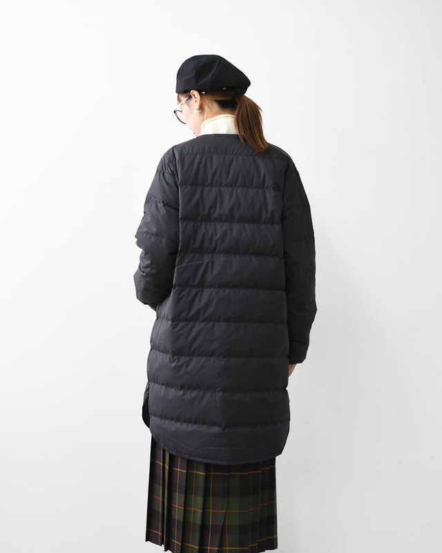 ダウンステッチ幅を太めにとった、ノーカラーのライトダウンコート。